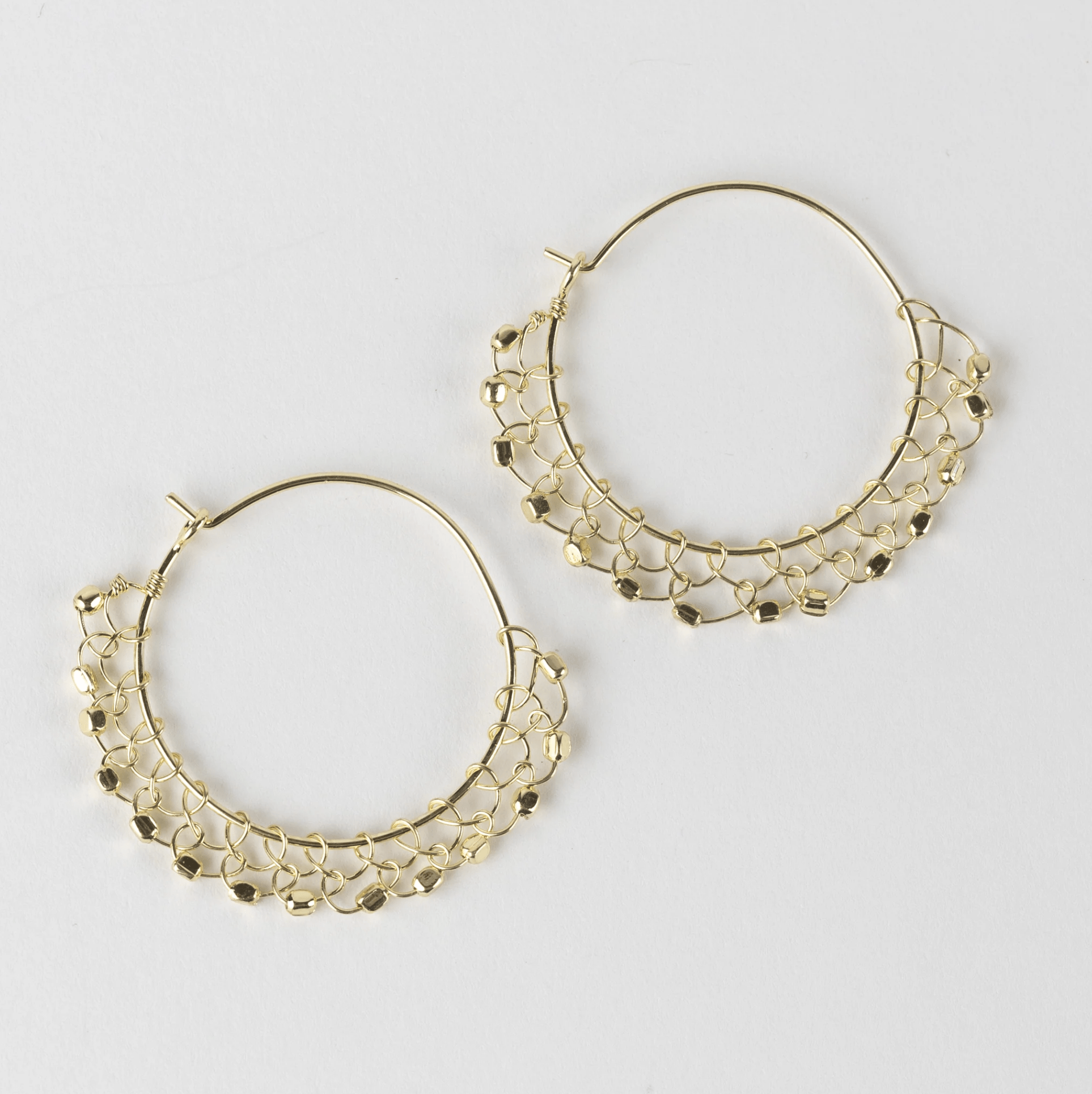 Handcrafted in India these earrings are made unique by the intricate macrame design that runs along the bottom half, setting them apart from traditional hoop earrings. These elegant round wire hoops come with an easy-to-lock closure that makes them incredibly effortless. Add these earrings to your collection and pull off a stunning look that’s sure to turn heads!